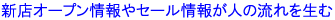 エントランスで、新店オープン情報や各店セール情報、店舗紹介など、新鮮な情報をおおきく取り上げることで、