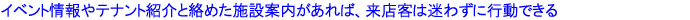 施設内マップとイベント情報やテナント紹介を合わせて提供することで、来店客はよりイメージしやすく、